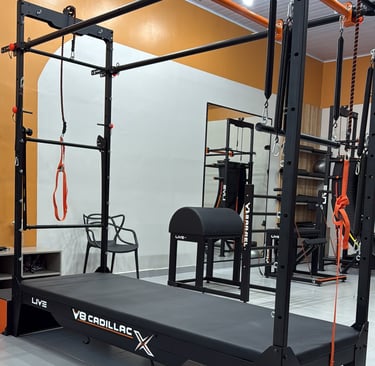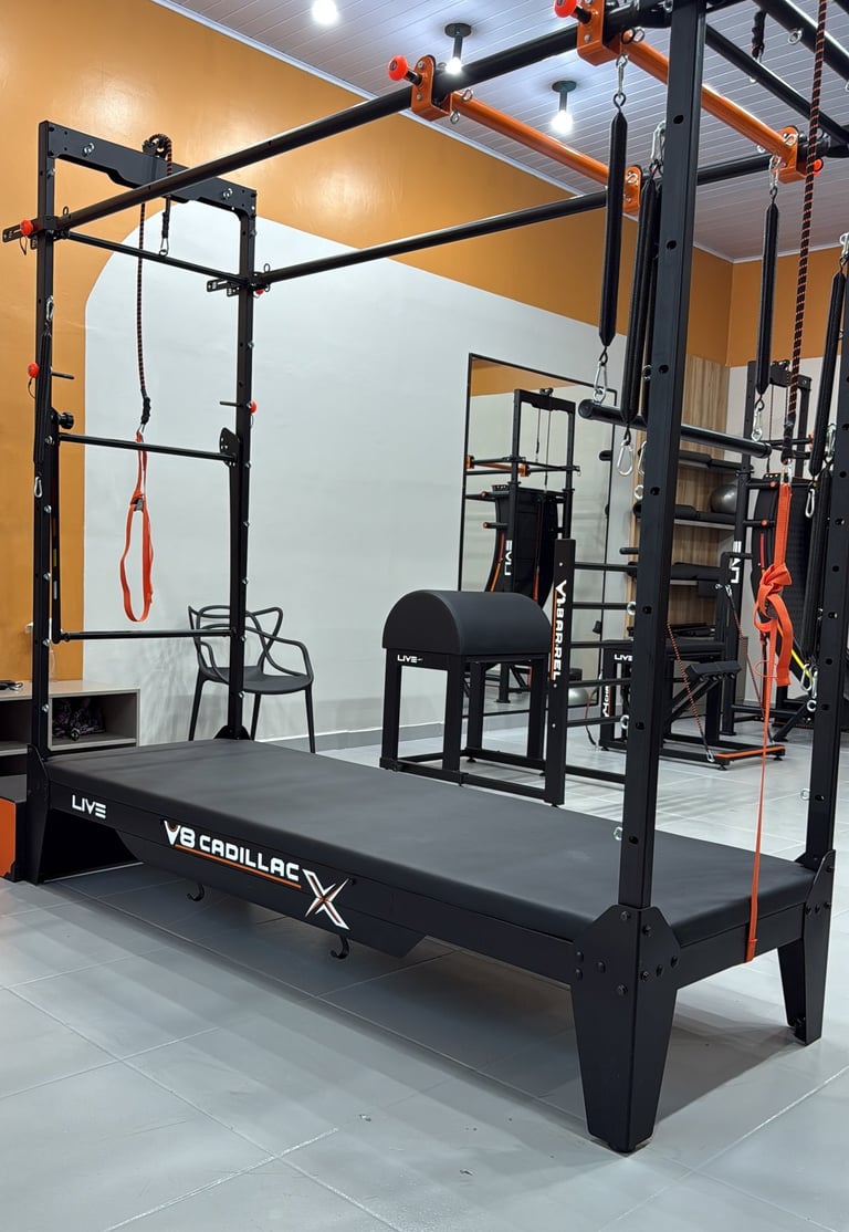 O Cadillac traz uma moldura com barras, alças e molas — o que permite uma liberdade enorme de movimentos: deitados, sentados, de pé, puxadas, alongamentos, mobilidade, força… muito além do que o Reformer entrega.